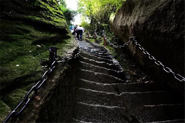 云梯高十余米,與地面垂直呈90度角,中上部外突,呈倒坎崖之勢。梯上置懸索三條,游人挽索而攀,身體無法貼近崖壁,因而隨索擺動(dòng),心旌神搖,如同云駕霧,故名云梯。云梯的開辟,既縮短了自中峰登東峰的時(shí)間,又增加了游人履險(xiǎn)的興趣,開通以來,許多游客都愿在此攀登,一試身手。