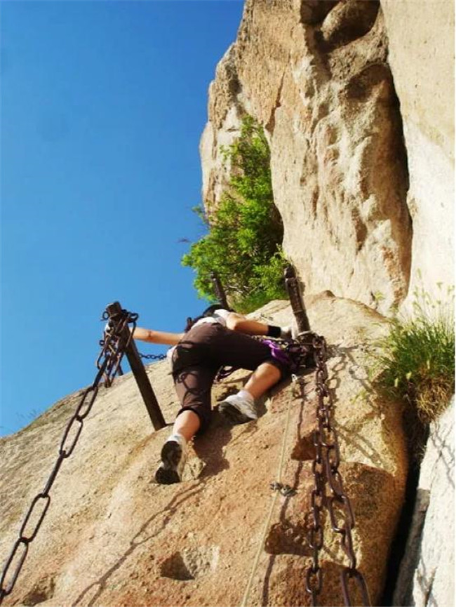 這是一條峭壁上的大裂縫,陷在兩旁的巨石之間,共370余級臺(tái)階坡度極陡,每級臺(tái)階的寬度不過三分之一的腳掌,幸好兩旁都有可助攀爬的鐵鏈。仰望天際,一線天開。俯視腳下,如臨深淵。石級頂端有如井口,倘若把“井口”用鐵蓋蓋住,通往華山的道路便被堵塞,所以稱之為“太華咽喉”。