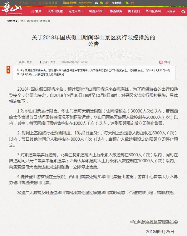 2018年國慶假日即將來臨,預(yù)計(jì)屆時華山景區(qū)將迎來客流高峰,為了確保游客的出行和游覽安全,經(jīng)研究決定,自2018年9月30日18時至10月8日8時,對景區(qū)客流實(shí)行限控措施。具體措施如下: