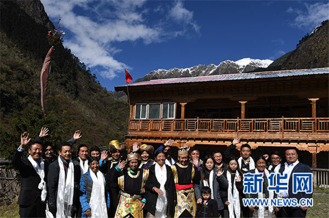 卓嘎、央宗姐妹和玉麥鄉(xiāng)干部群眾合影。 新華社記者 普布扎西 攝