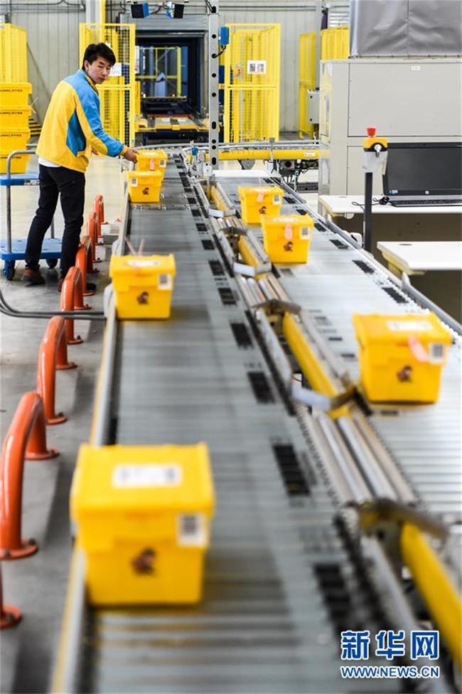 在江蘇南京蘇寧云倉(cāng)物流基地,工作人員將包裝好的“共享快遞盒”放到傳送帶上,準(zhǔn)備進(jìn)行分揀運(yùn)輸(2017年10月31日攝)。新華社記者 李博 攝