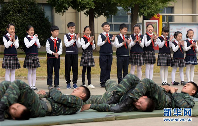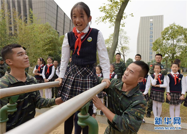 10月9日,少先隊(duì)員們?cè)谖渚不湛傟?duì)合肥支隊(duì)體驗(yàn)官兵訓(xùn)練。