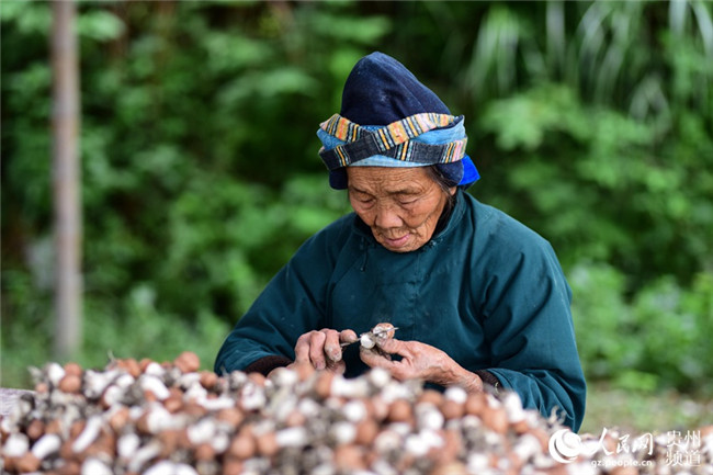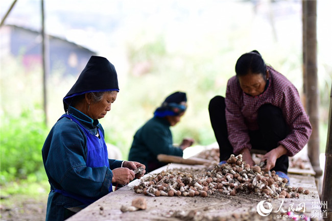 10月10日,村民在貴州省黔東南苗族侗族自治州丹寨縣排調(diào)鎮(zhèn)也改村姬松茸種植基地對剛采摘的姬松茸進(jìn)行削根處理。楊武魁 攝