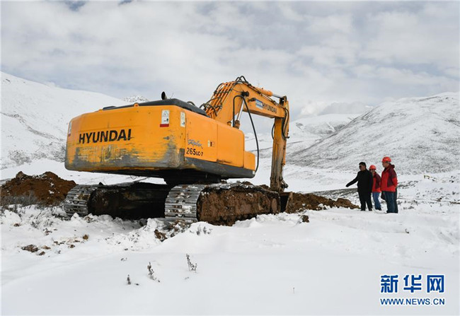 工作人員駕駛大型機械在昌都市江達縣的高山牧場上搶通道路(10月14日攝)。新華社記者 劉東君 攝