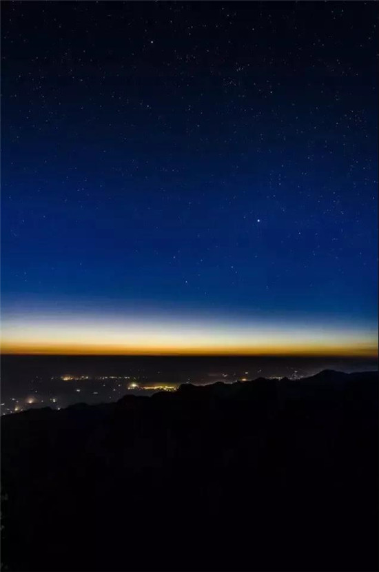 繁眼的星光,滿山的燈光,將華山映襯得一派柔和,這里的夜屏蔽了城市的喧囂與繁華,有著不屬于城市的寧靜與美麗。