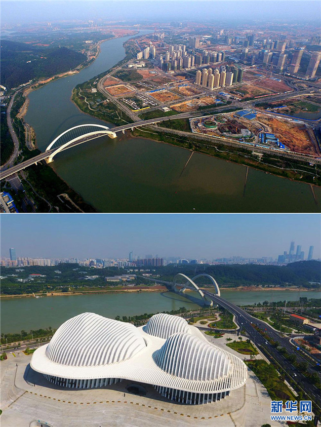 拼版照片。上圖為建設(shè)中的廣西南寧市五象新區(qū)(2016年5月2日,新華社發(fā) 任鵬飛 攝);下圖為無人機(jī)航拍五象新區(qū)的廣西文化藝術(shù)中心(2018年10月22日,新華網(wǎng) 章佳禮 攝)