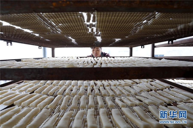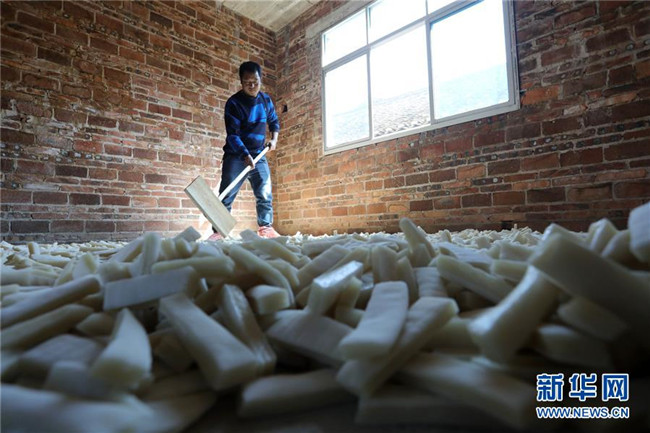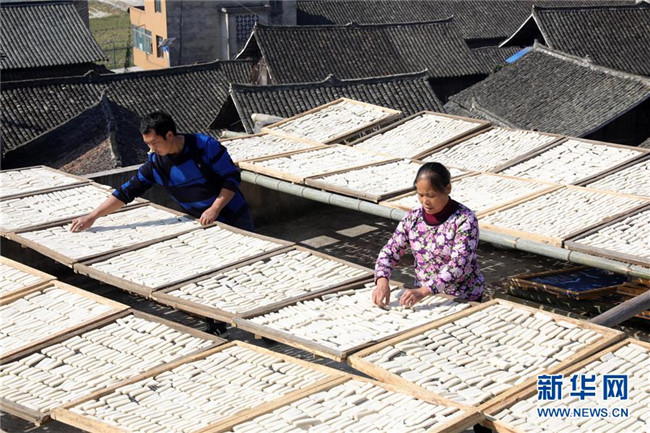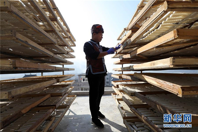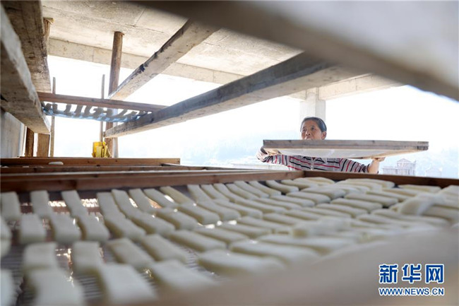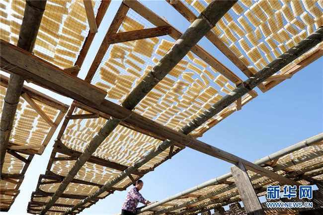 11月4日,在貴州省黎平縣中潮鎮(zhèn)佳所侗寨,村民在晾曬“侗果”粑塊。 近日,貴州省黔東南苗族侗族自治州黎平縣中潮鎮(zhèn)佳所侗寨的村民們搶抓晴好天氣,忙著制作、晾曬“侗果”,侗寨里一派忙碌。“侗果”是當?shù)囟弊逋捅貍涞奶厣朗?,是將蒸熟的糯米切成小粑塊后,再經(jīng)曬干、油炸、澆紅糖和上芝麻等工序制作而成。 新華社發(fā)(楊代富 攝)