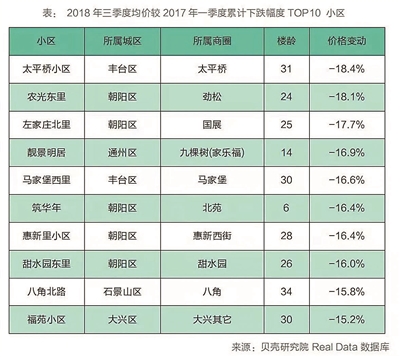 一是品質(zhì)較差的老房子。2018年三季度均價較2017年一季度均價累計跌幅最大的是物業(yè)費低于3塊、30年以上的房屋,表明品質(zhì)差的老房屋抗跌性較弱。比如,石景山由于區(qū)域內(nèi)房源房齡較大,均價回調(diào)幅度也較大,2018年三季度累計跌幅達(dá)9.0%。篩選2018年三季度均價跌幅TOP10 小區(qū),多數(shù)樓齡在20年以上。