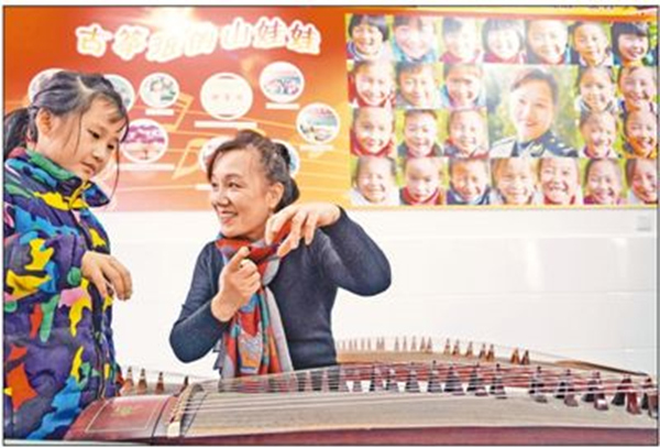 安徽省金寨縣梅山鎮(zhèn)小南京村“山娃娃古箏班”創(chuàng)辦4年來(lái),為三十幾名留守兒童帶來(lái)溫暖。創(chuàng)辦人俞曉冬原為南京軍區(qū)前線文工團(tuán)國(guó)家一級(jí)古箏演奏家。2014年,她自籌資金20多萬(wàn)元購(gòu)置40多架古箏,在小南京學(xué)校建起一間古箏教室,利用音樂課、課余和周末時(shí)間無(wú)償對(duì)山村留守兒童進(jìn)行古箏培訓(xùn)和音樂教育。一年中,俞曉冬有150多天都住在學(xué)校,與山娃們朝夕相處,孩子們親切地稱她為“古箏媽媽”。一批批山娃娃在小學(xué)畢業(yè)前通過全國(guó)器樂水平十級(jí)考試,還多次參加國(guó)內(nèi)公益演出。圖為俞曉冬老師在教留守兒童學(xué)古箏。(趙樹宴/攝)