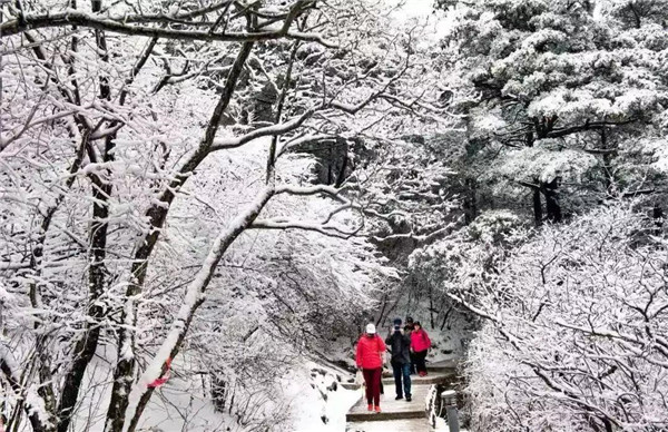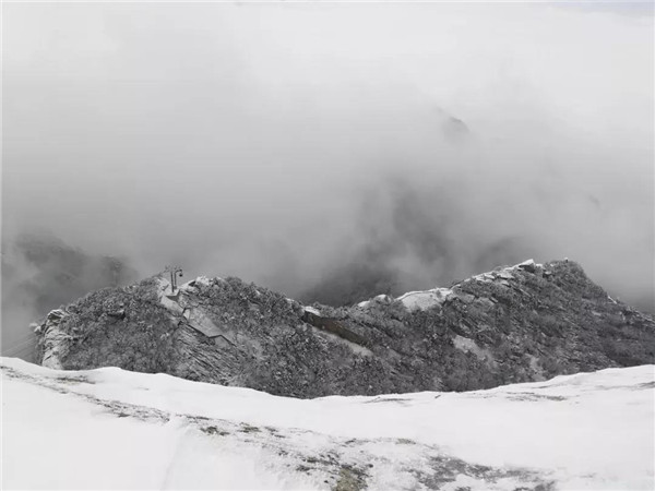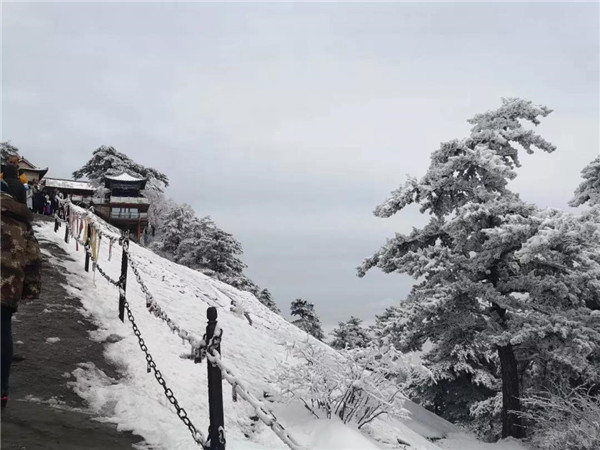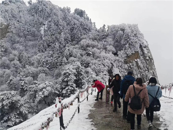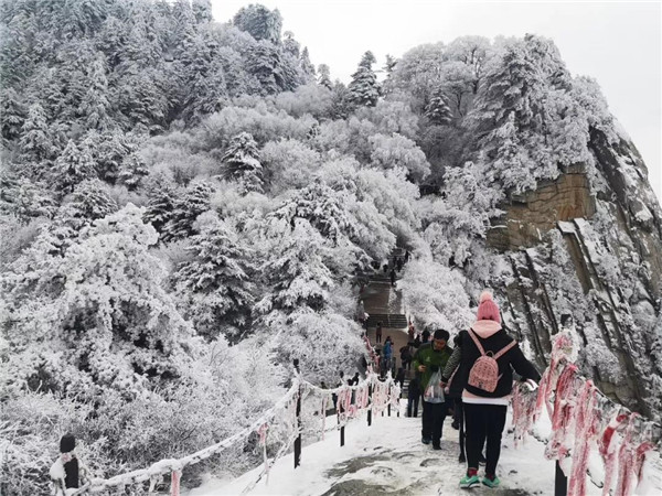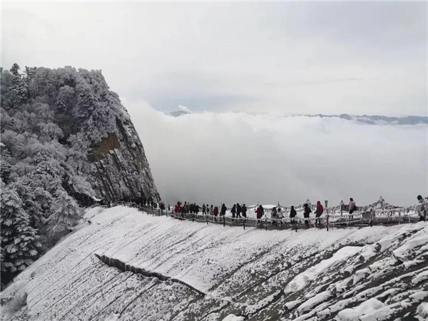 17日凌晨的一場(chǎng)大雪將西岳華山變成白雪皚皚的世界,白雪與蒼翠的華山奇松、靈動(dòng)的云海交相輝映,如夢(mèng)如幻;滿山遍野玉樹(shù)瓊花,樹(shù)枝上通體的霧凇晶瑩剔透,繪就冬日畫(huà)境,美不勝收,游人如置身人間仙境。