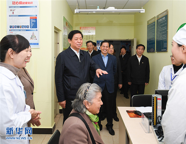 11月28日至12月1日,中共中央政治局常委、全國人大常委會委員長栗戰(zhàn)書在云南就制定基本醫(yī)療衛(wèi)生與健康促進(jìn)法開展立法調(diào)研。這是11月29日,栗戰(zhàn)書在昆明市西山區(qū)前衛(wèi)社區(qū)衛(wèi)生服務(wù)中心,與醫(yī)務(wù)人員和就診患者親切交談。 新華社記者 申宏 攝