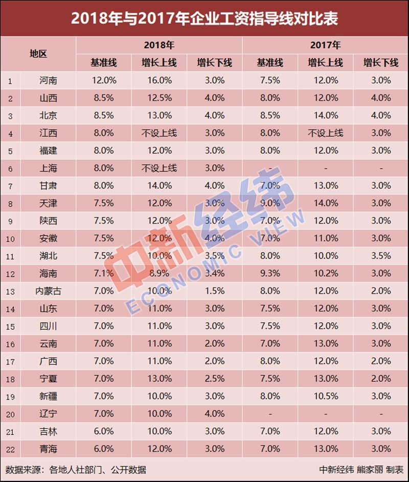中新經(jīng)緯客戶端(微信公眾號:jwview)對比22省份2017年與2018年的數(shù)據(jù)發(fā)現(xiàn),除了上海、遼寧(2017年企業(yè)工資指導(dǎo)線不明確),今年多地企業(yè)工資指導(dǎo)線的基準(zhǔn)線、上線和下線有所上調(diào)。