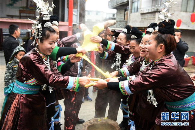 12月9日,貴州省黎平縣中潮鎮(zhèn)佳所侗寨的村民在打糍粑歡度侗年。