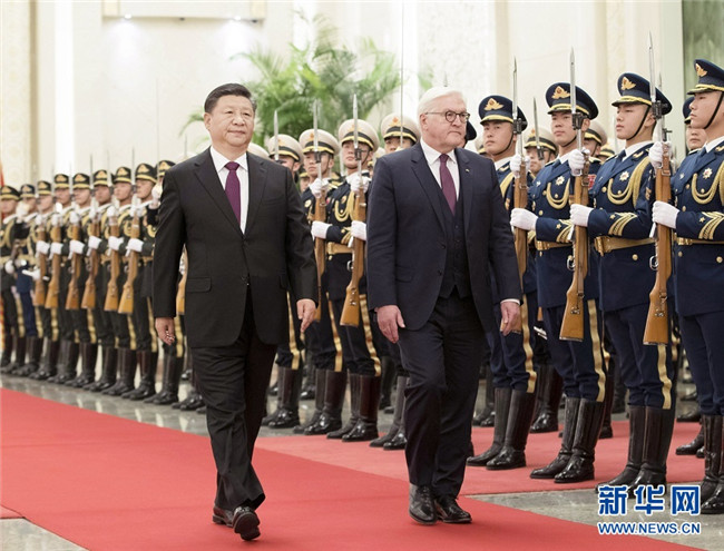 12月10日,國家主席習(xí)近平在北京人民大會(huì)堂同德國總統(tǒng)施泰因邁爾舉行會(huì)談。這是會(huì)談前,習(xí)近平在人民大會(huì)堂北大廳為施泰因邁爾舉行歡迎儀式?!⌒氯A社記者 王曄 攝