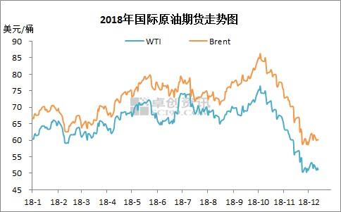 2018年國(guó)際原油期貨走勢(shì)圖。來(lái)源:卓創(chuàng)資訊