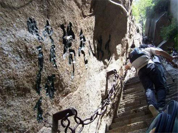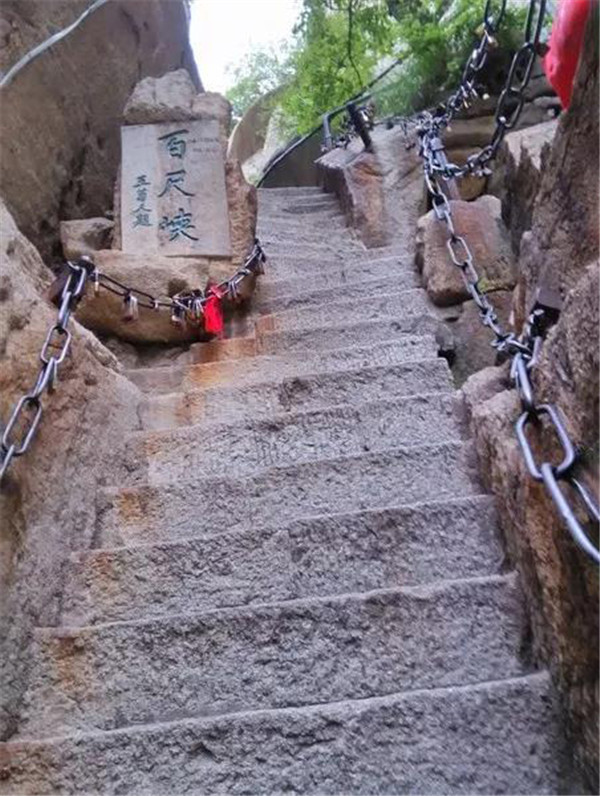 千尺幢位于回心石之上,是華山第一險(xiǎn)境。山幢壁直立,其間僅容二人上下穿行。兩邊鐵鏈垂直下垂,坡度為70°。從上到下共有370多個(gè)臺(tái)階,皆不滿足寬。