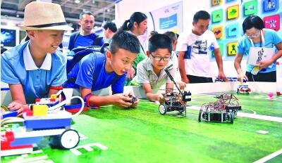 小學(xué)生在2018世界機(jī)器人大會(huì)一處展臺體驗(yàn)編程機(jī)器人。新華社發(fā)