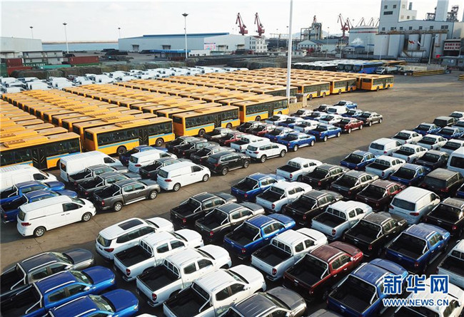 大批國(guó)產(chǎn)車(chē)輛在江蘇連云港港口碼頭等待裝船(2018年12月31日無(wú)人機(jī)拍攝)。新華社發(fā)(耿玉和 攝)
