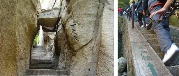 千尺幢,是經(jīng)華山峪登主峰的必經(jīng)之道。這里原為一崖間裂隙,直立70度,后來人們沿隙鑿?fù)爻陕罚惺A370級,階寬僅容半足,游人登臨時(shí),仰視一線天,俯視若臨深井。百尺峽在“千尺幢上,也是巖隙險(xiǎn)道,有石階91級,游人須挽索而上。有詩云:“幢去峽復(fù)來,天險(xiǎn)不可瞬,雖云百尺峽,一尺一千仞”。