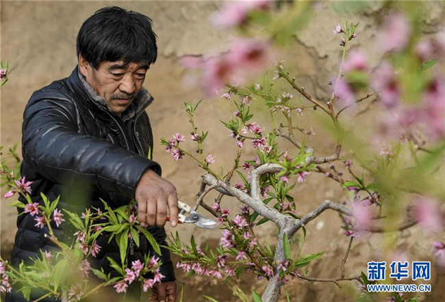 1月27日,在新疆鄯善縣辟展鎮(zhèn)大東湖溫室大棚基地內,種植戶修剪桃樹花枝。新華社記者王菲攝
