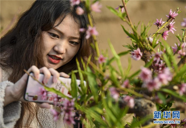 1月27日,在新疆鄯善縣辟展鎮(zhèn)大東湖溫室大棚基地內,游客在桃花前拍照。新華社記者王菲攝