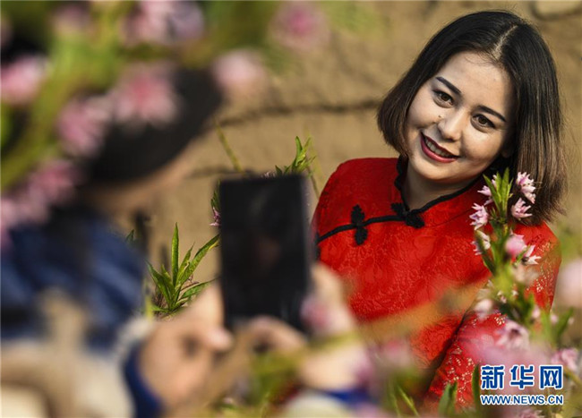 近日,在新疆鄯善縣的溫室大棚基地內,桃花綻放,吸引不少游客前來游玩觀賞。新華社記者王菲攝