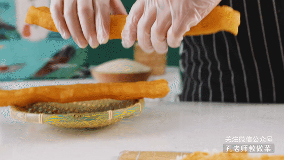 7.老油條從中間掰開(kāi),疊放至大根上。(油條一般用涼透了又帶有點(diǎn)韌性的,如果喜歡吃酥脆的話,可要用上熱騰騰的嫩油條。)