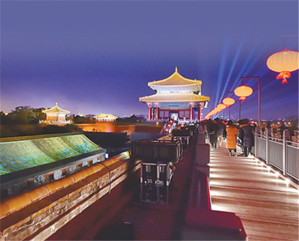 觀眾入場前,可觀賞午門城樓及東、西雁翅樓在燈光映照下的壯美雄姿。自午門入場后,首先觀賞點亮后的太和門廣場,隨后由午門西馬道登午門城樓,參觀“紫禁城里過大年”展覽,在東雁翅樓欣賞中央民族樂團琵琶演奏家趙聰及其團隊的演奏。結束午門展廳參觀后,觀眾沿著由紅燈籠點綴的城墻步行至東南角樓,觀看虛擬現(xiàn)實影片《角樓》,隨后來到東華門城樓,參觀“營造之道——紫禁城建筑藝術展”。當走過近千米長的布滿紅燈籠的故宮東城墻時,可以看到臨近城墻西側的部分古建筑也被點亮,聆聽暢音閣戲樓傳來的戲曲聲。到達東北角樓后,觀眾步行至神武門,在這一區(qū)域可以觀賞到城墻南北兩側通過藝術燈光投影于建筑屋頂上的《千里江山圖》等作品,從而產(chǎn)生人在畫中游的感覺。離開神武門城樓后,神武門外東、西兩側的角樓餐廳和角樓咖啡靜候光臨,從而結束此次“上元之夜”文化活動。