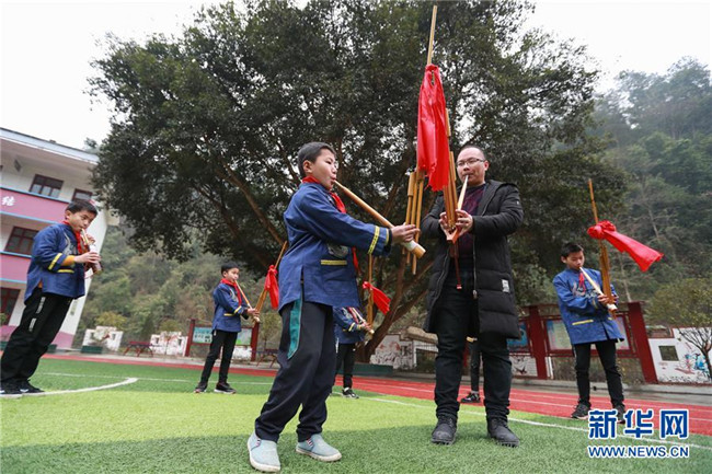 2月26日,榕江縣水尾水族鄉(xiāng)中心學(xué)校的學(xué)生在吹奏蘆笙。近年來,貴州省黔東南苗族侗族自治州榕江縣水尾水族鄉(xiāng)倡導(dǎo)水族文化進校園,深受學(xué)生喜愛。新華社記者劉續(xù)攝