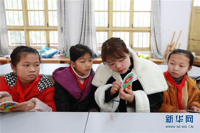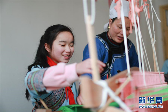 2月26日,在榕江縣水尾水族鄉(xiāng)中心學(xué)校,一名學(xué)生在向水族民間藝人學(xué)習(xí)織布。近年來,貴州省黔東南苗族侗族自治州榕江縣水尾水族鄉(xiāng)倡導(dǎo)水族文化進校園,深受學(xué)生喜愛。新華社記者劉續(xù)攝
