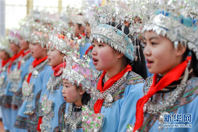 2月26日,榕江縣水尾水族鄉(xiāng)中心學(xué)校的學(xué)生們在唱水歌。近年來,貴州省黔東南苗族侗族自治州榕江縣水尾水族鄉(xiāng)倡導(dǎo)水族文化進校園,深受學(xué)生喜愛。新華社記者劉續(xù)攝
