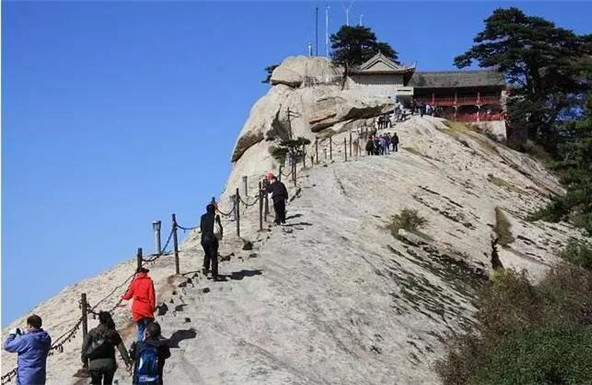 而被大家熟悉的長空棧道,則位于華山南峰東側(cè)山腰,是華山派第一代宗師元代高道賀志真為遠離塵世靜修成仙,在萬仞絕壁上鑲嵌石釘搭木椽而筑。去過華山的朋友,大部分肯定體驗過華山長空棧道,在千仞絕壁之上,左邊是大山,而右邊就是萬丈深淵,想要通過僅僅是靠著腳下這一寬30多公分的棧道,周圍無任何欄桿,但令人興慶的是,在崖上還有釘?shù)睦喂痰蔫F索可以抓住,讓探險者可以稍微放松一點心情。