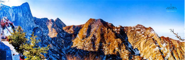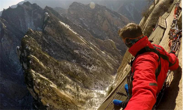 我獨自一人出發(fā),一段垂直的石隙,鐵條插在巖石之中,道路向下延伸,風(fēng)刮得很大,我雙手麻木,死死地抓住鐵鏈,慢慢向下挪動,腳下是一千米深的峽谷,這是一個恐懼與光榮交織的時刻。我走在棧道上,左右上下地欣賞著風(fēng)景,周圍大山巨大而孤獨,我感覺自己就像是一個塵埃,真的太渺小了。冰屑落到頭頂上,幸虧不是石塊。我聽到一群中國游客笑著從石隙中下來,我停下來照了幾張相,要回去必須原路返回,這同樣不容易,我很感謝地歸還了手套,繼續(xù)向其他山峰攀登。由于有安全保護措施,因此我不認為華山是“世界上最危險的道路”。