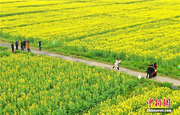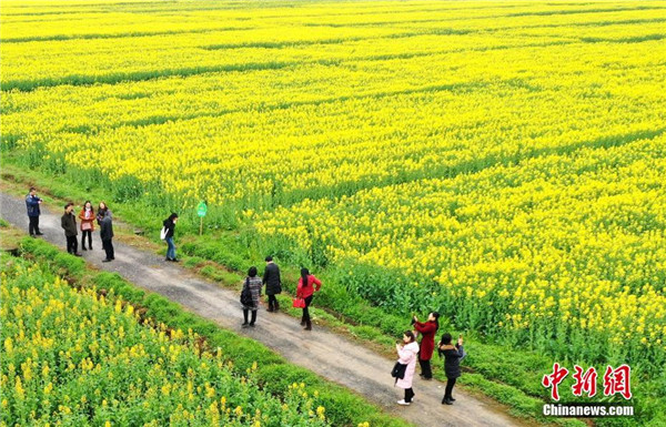 3月2日,江西省吉水縣烏江鎮(zhèn)楓坪千畝油菜花基地油菜花盛開,許多游客前來(lái)觀賞拍照徜徉在花海中。郭弘毅 攝