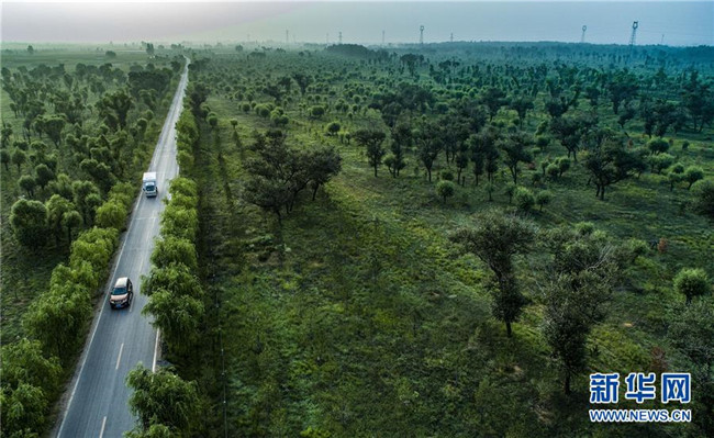汽車行駛在陜西省榆林市靖邊縣東坑鎮(zhèn)新建村的道路上(2018年8月1日無(wú)人機(jī)拍攝)。陜西省開(kāi)展的天然林保護(hù)工程和全面治理荒沙行動(dòng),極大改善了毛烏素的生態(tài)環(huán)境,也使沙漠南緣的陜西省榆林市實(shí)現(xiàn)從“沙進(jìn)人退”到“綠進(jìn)沙退”的轉(zhuǎn)變。 新華社記者 陶明 攝