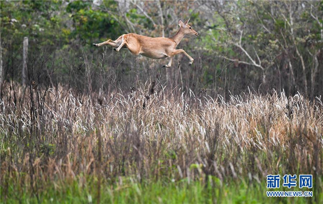 在海南大田坡鹿自然保護(hù)區(qū)內(nèi),一只坡鹿飛躍草叢(2018年4月3日攝)。國(guó)家一級(jí)保護(hù)動(dòng)物海南坡鹿是特產(chǎn)于海南島的熱帶珍稀鹿種,20世紀(jì)曾瀕臨滅絕。近年來(lái),當(dāng)?shù)赝ㄟ^(guò)多種方式開(kāi)展保護(hù)?,F(xiàn)在,海南坡鹿數(shù)量逐漸增多、種群逐漸穩(wěn)定,成為海南綠色生態(tài)的一張名片。 新華社記者 楊冠宇 攝