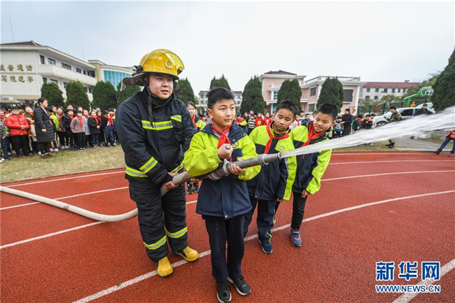 3月6日,東林鎮(zhèn)消防應(yīng)急救援隊(duì)的隊(duì)員帶領(lǐng)小學(xué)生們體驗(yàn)水槍的使用。當(dāng)日,浙江省湖州市吳興區(qū)東林鎮(zhèn)東林小學(xué)舉行“開學(xué)第一課”消防安全進(jìn)校園活動(dòng)。東林鎮(zhèn)消防應(yīng)急救援隊(duì)的隊(duì)員們通過普及消防安全知識、應(yīng)急逃生知識等內(nèi)容,讓學(xué)生們了解日常消防安全常識,增強(qiáng)消防安全意識。新華社記者 徐昱 攝