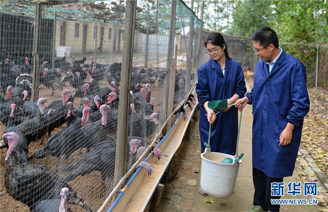 在江蘇省建湖縣陳甲村,返鄉(xiāng)創(chuàng)業(yè)的魯曼(左)和丈夫在養(yǎng)殖基地喂養(yǎng)火雞(2015年9月23日攝)。魯曼和丈夫的返鄉(xiāng)創(chuàng)業(yè),帶動陳甲村發(fā)生巨變,回首創(chuàng)業(yè)的經(jīng)歷,已是全國人大代表的魯曼直言:“奮斗是艱辛的,也是幸福的。” 新華社記者 季春鵬 攝