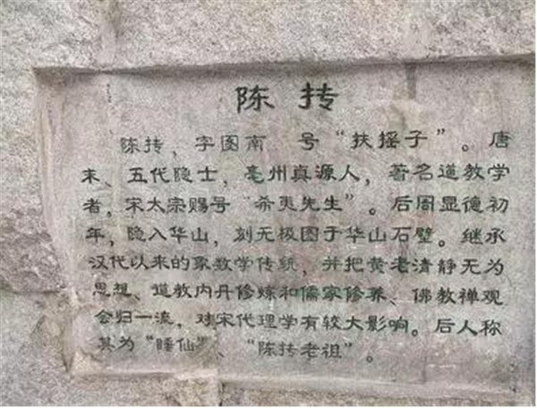 陳摶:陳摶(872年—989年),字“圖南”,號“扶搖子”、“希夷先生”(“希”指視而不見,“夷”指聽而不聞),常被視為神仙,尊稱為陳摶老祖、希夷祖師等。主張以睡眠,休養(yǎng)生息,時常一眠數(shù)日,人稱睡仙。相傳紫微斗數(shù)及無極圖說皆為陳摶之創(chuàng)作。五代末,宋朝初期亳州真源(今河南鹿邑)人,著名華山派道士。