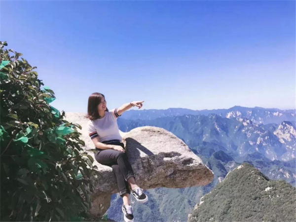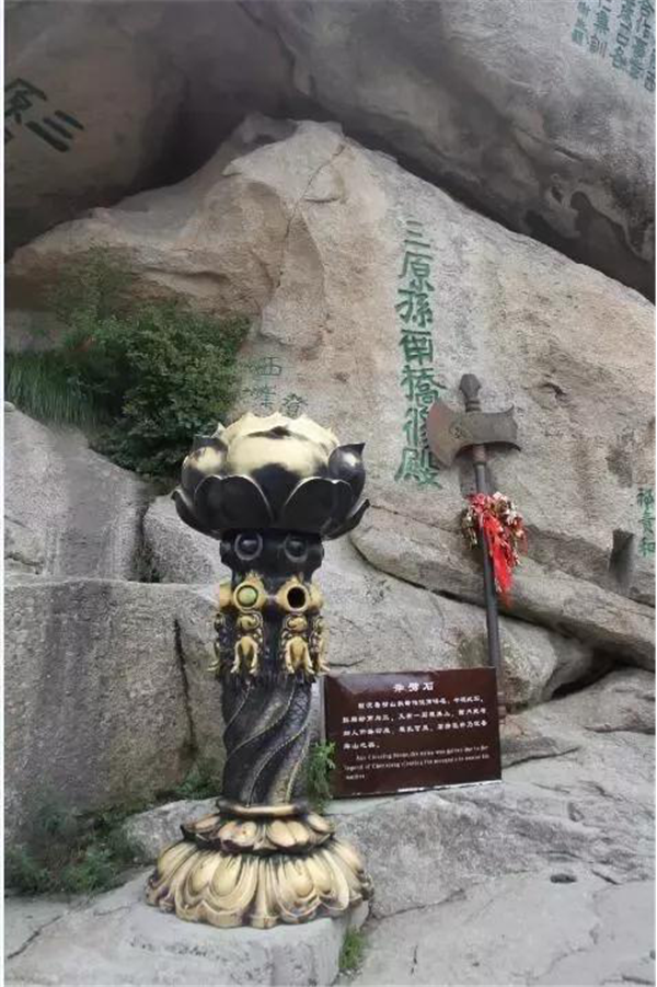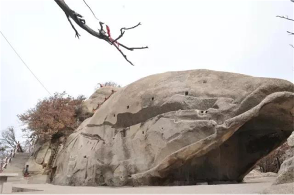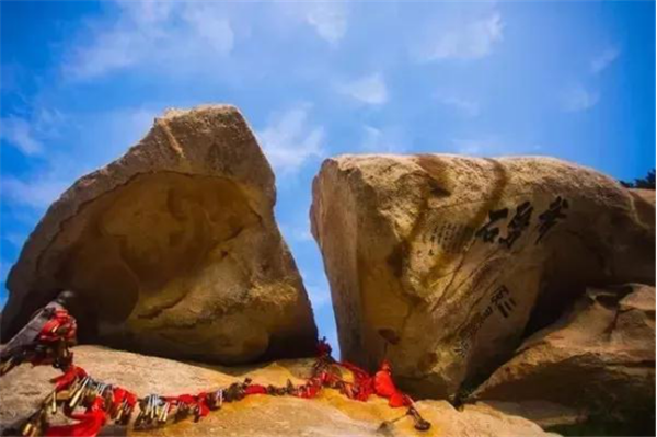 奇特之處:此奇石位于蓮花峰巔。一巨石一分為三,截面如刀削斧劈,石縫能容人出入,石下有凹凸,形似婦人仰臥的印痕,形象生動(dòng)。