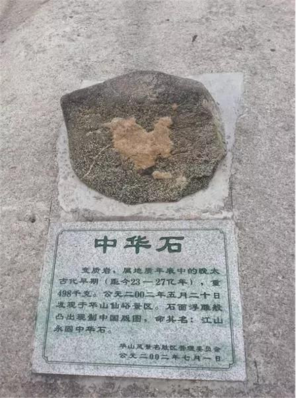 “中華石”于2002年5月20日在華山仙峪景區(qū)被發(fā)現(xiàn)。在一淡墨色花崗巖石面上,浮雕般凸現(xiàn)出一塊白色石圖,此圖酷似現(xiàn)制中國(guó)版圖,十分形象逼真。該石重約498千克,云母花崗巖石,大約形成于三千萬(wàn)年前的白堊時(shí)期,現(xiàn)置北峰。