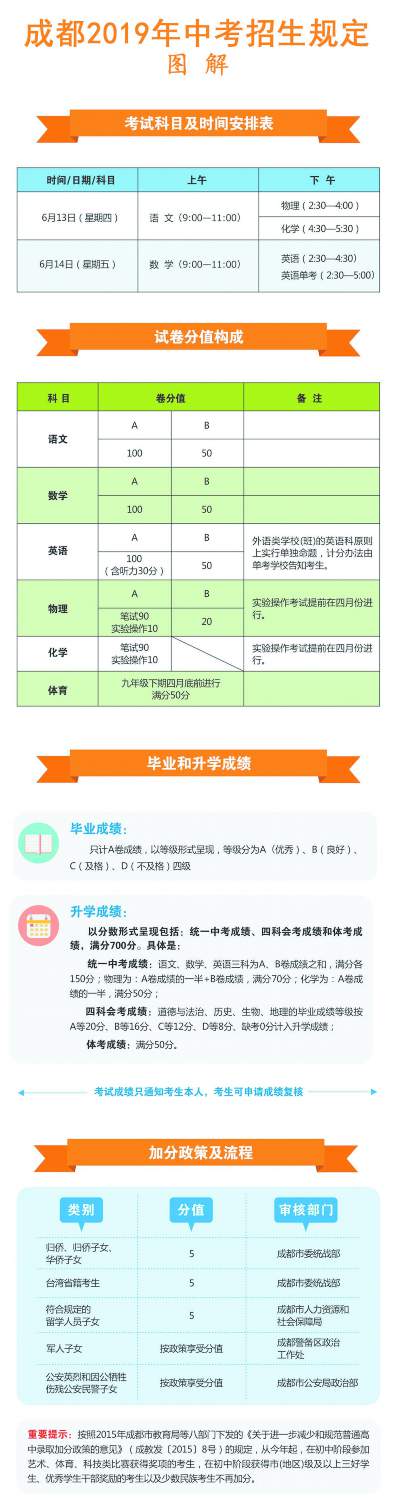 今年中考考試時間與往年一樣,為6月13日、14日,考試科目和計分辦法均未作調(diào)整。也即是說,今年中考統(tǒng)一考試科目依然為語文、數(shù)學(xué)、英語、物理、化學(xué)、體育六科。其中,物理、化學(xué)包括實驗操作考試。體育考試以及物理、化學(xué)實驗操作考試在九年級下期4月底以前,由各區(qū)(市)縣組織進(jìn)行。九年級結(jié)束時,語、數(shù)、英、物、化五科的畢業(yè)考試與升學(xué)考試一并進(jìn)行,各科筆試考試均為閉卷考試,具體時間安排詳見圖解。其中,外語類學(xué)校(班),如成外實外等校的英語科,原則上單獨(dú)命題,統(tǒng)一考試。