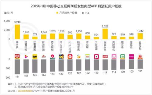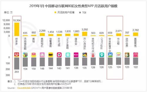 在拼多多、今日頭條、新浪微博、美顏相機(jī)及各類短視頻等女性最愛打開的20多個(gè)APP中,移動互聯(lián)網(wǎng)70和80后女性最愛使用的典型APP是新電商平臺拼多多,達(dá)到3240萬,TGI(Target Group Index,目標(biāo)群體指數(shù))高達(dá)80.5%,超過各類短視頻應(yīng)用。