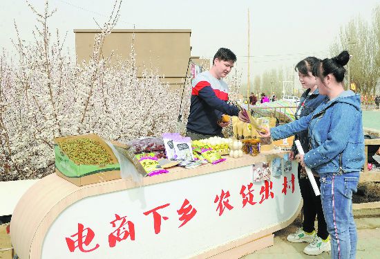3月23日,新疆托克遜縣夏鄉(xiāng)南湖村電子商務(wù)服務(wù)點(diǎn)的工作人員在為游客介紹當(dāng)?shù)氐奶厣r(nóng)產(chǎn)品。 近年來(lái),托克遜縣通過(guò)構(gòu)建電子商務(wù)培訓(xùn)體系、農(nóng)產(chǎn)品營(yíng)銷(xiāo)體系等,幫助當(dāng)?shù)剞r(nóng)民開(kāi)設(shè)網(wǎng)店,尋找代銷(xiāo)產(chǎn)品、入駐網(wǎng)絡(luò)銷(xiāo)售平臺(tái),引領(lǐng)農(nóng)民走上致富路。(秦梅花)