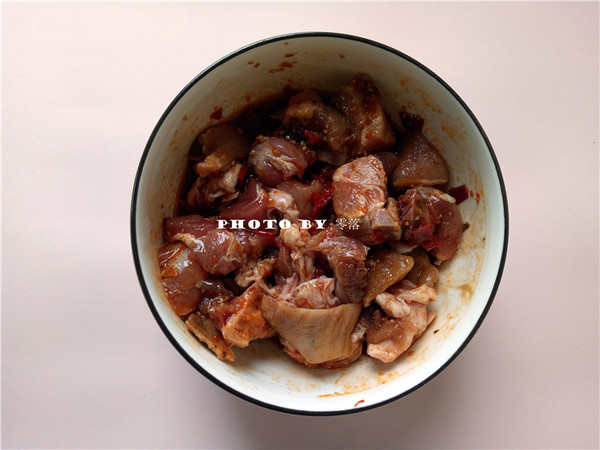 2.豬肉里調(diào)入料酒、醬油、鹽、糖、鮮椒醬、蠔油;