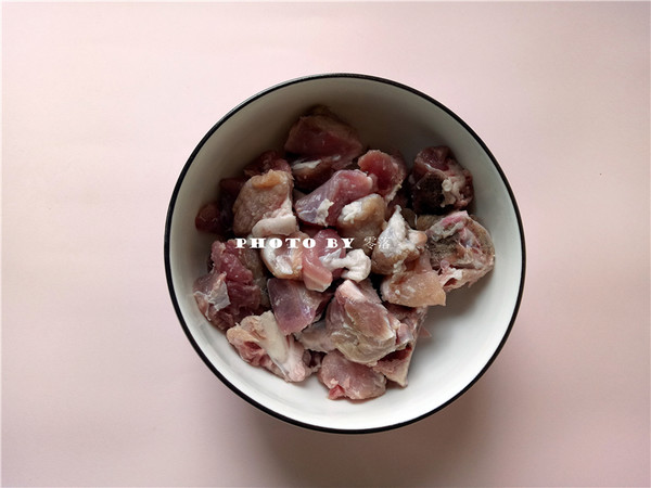5.將豬肉、板栗放入電燉鍋,攪拌均勻后,倒入適量料酒;