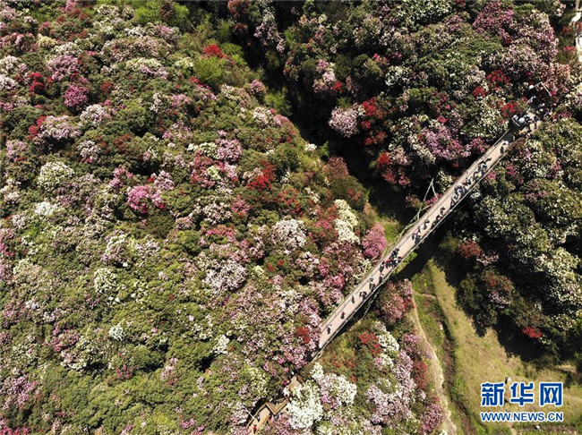 4月7日,游客在貴州省畢節(jié)市百里杜鵑金坡景區(qū)游覽(無人機(jī)拍攝)。清明時(shí)節(jié),人們外出旅游,踏青賞花,感受春天的美好。 新華社發(fā)(韓賢普 攝)