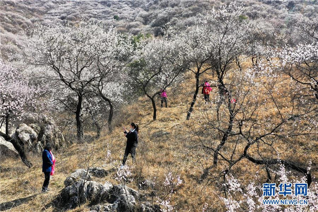 4月7日,游客在河北省遷西縣興城鎮(zhèn)杏花谷參觀(無人機(jī)拍攝)。清明時(shí)節(jié),人們外出旅游,踏青賞花,感受春天的美好。 新華社發(fā)(王愛軍 攝)
