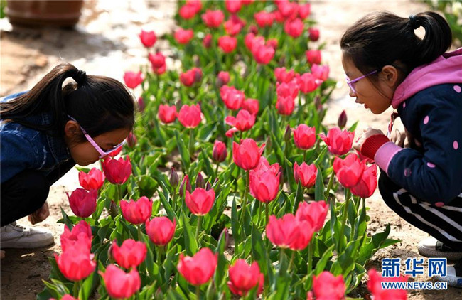 4月7日,在石家莊市植物園,兩名小游客欣賞盛開的花朵。清明時(shí)節(jié),人們外出旅游,踏青賞花,感受春天的美好。 新華社發(fā)(陳其保 攝)