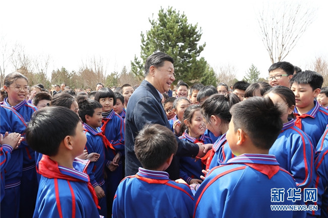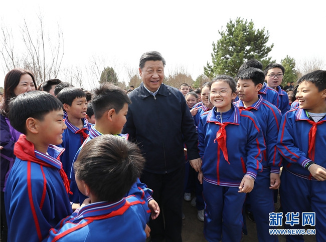 4月8日,黨和國家領(lǐng)導(dǎo)人習(xí)近平、栗戰(zhàn)書、汪洋、王滬寧、趙樂際、韓正、王岐山等來到北京市通州區(qū)永順鎮(zhèn)參加首都義務(wù)植樹活動(dòng)。這是習(xí)近平同少先隊(duì)員在一起。 新華社記者 鞠鵬 攝